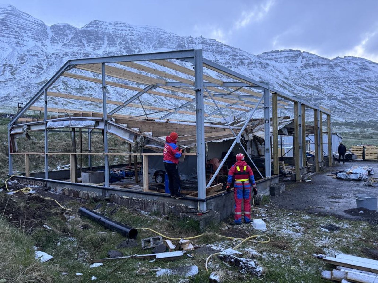 Björgunarsveitin Gerpir í Neskaupstað hefti fok frá húsi í endurgerð í nótt. Mynd: Hlynur Sveinsson