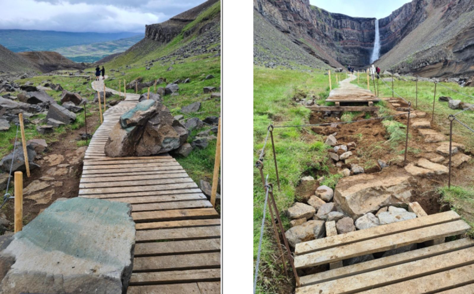 Tvær myndir sem Rán Finnsdóttir tók í sumar ofarlega á stígnum að Hengifossi. Mat landvarða þar er að gera þarf töluvert betur að merkja og stika en gert hefur verið.