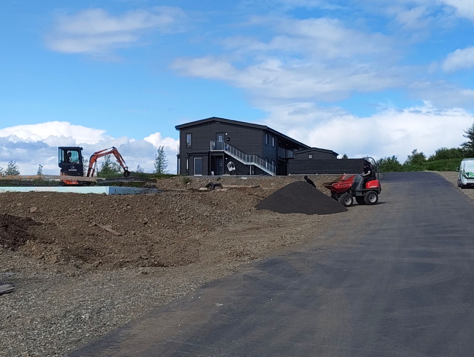 Þrír starfsmenn Búðings ehf. voru að störfum í Selbrún fyrr í dag þegar Austurfrétt bar að garði. Mynd AE