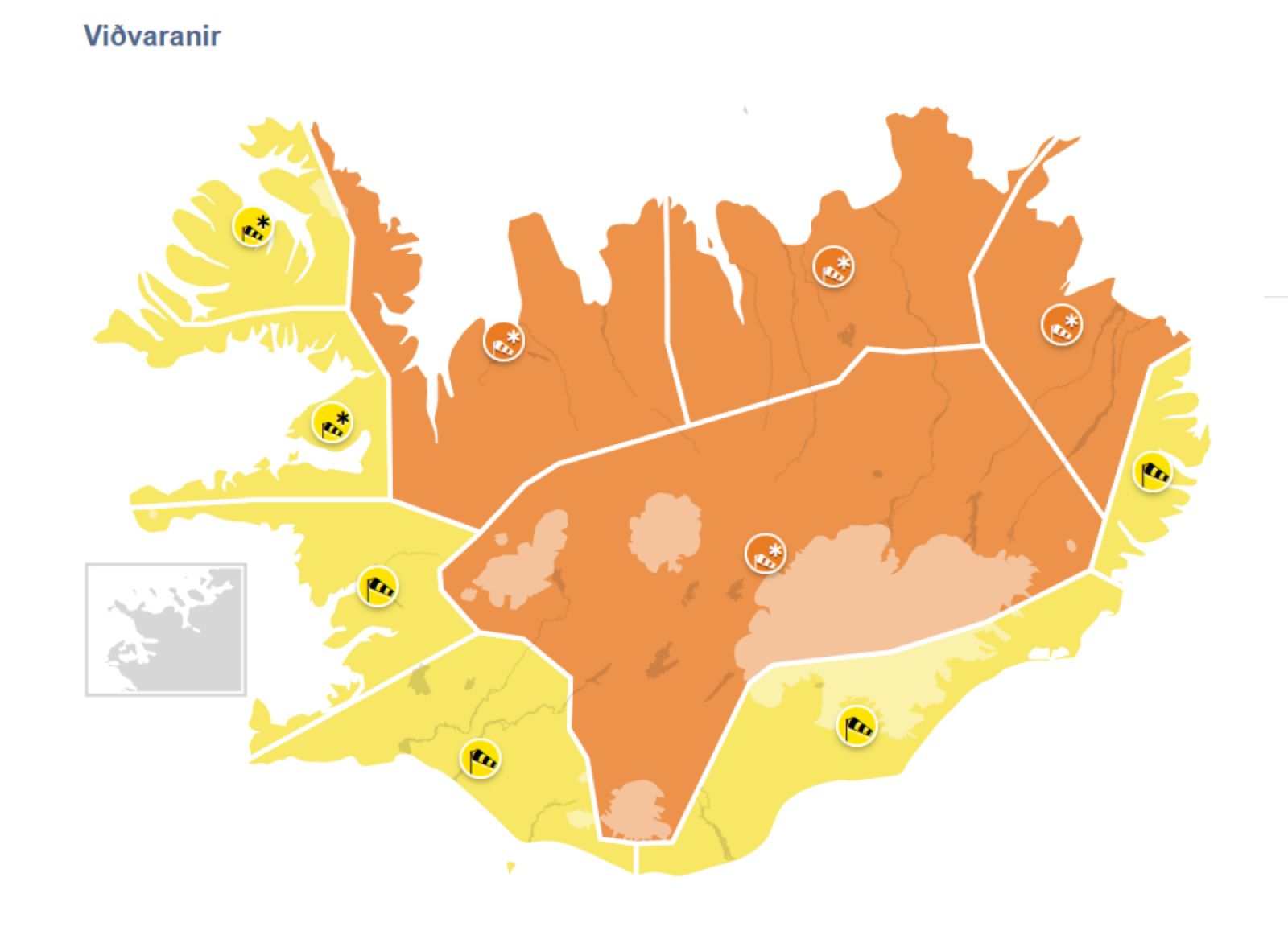 Appelsínugular og gular viðvaranir taka gildi upp úr hádeginu á sunnudaginn kemur vegna storms og mikillar úrkomu en gert er ráð fyrir að veðurofsinn gangi ekki niður fyrr en líður fram á mánudaginn.
