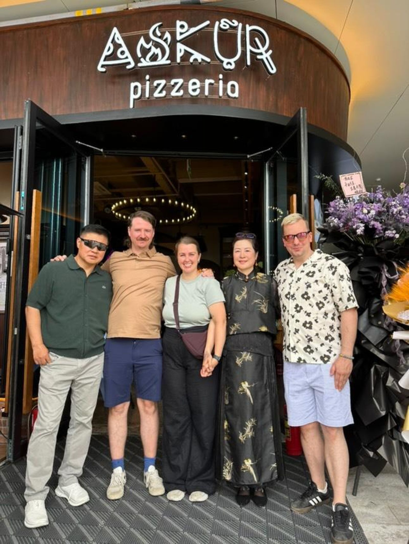 „Askur er notaður til að draga fólk að, það er framandi að vera með íslenskar pizzur. Hr. Wang hefur séð um alla hönnun en við bent á hvað þyrfti í pizzaferðina. Jón og einn pizzakokkanna okkar fóru út 18. júní til að hjálpa til á lokametrunum og þjálfa starfsliðið. Við Unnur komum síðan út nokkrum dögum síðar. Jafnvel tíu dögum fyrir opnun fannst okkur ótrúlegt að staðurinn myndi opna á réttum tíma en vinnan í bæði staðnum og verslunarmiðstöðinni hefur gengið fáránlega hratt.“