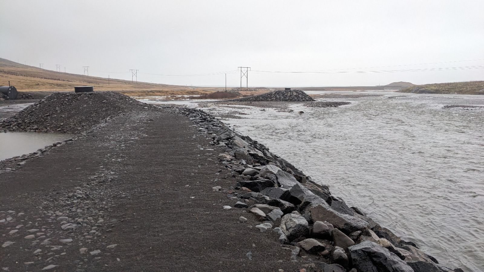 Mynd úr smiðju HEF-veitna af lokahúsi og borholum við eyrarnar en það allt varið af grjótgörðum eins og sjá má.