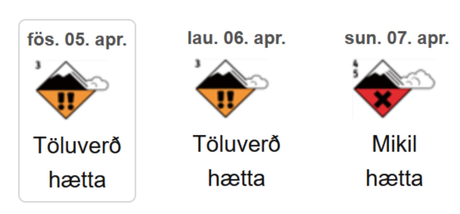 Í útskýringum vegna aukinnar hættu segir að lagskiptir flekar hafi myndast yfir páskana í NA-éljagangi en þeir geti verið óstöðugir. Meðan veður helst gott stafar hætta fyrst og fremst af mannavöldum en aftur á að fara að snjóa og skafa um helgina og þar með aukast líkurnar á stærri náttúrulegum flóðum.
