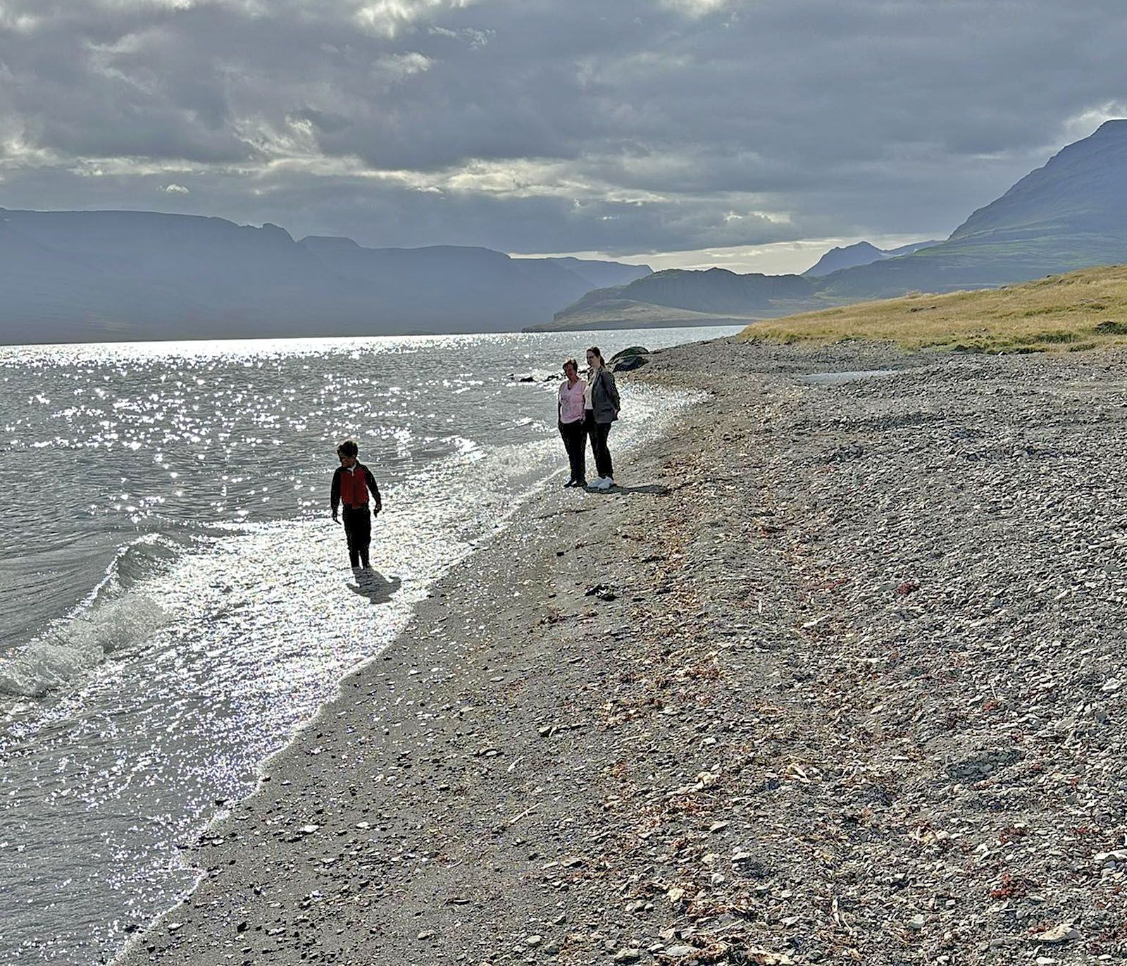 Fólk á ferli í fjörunni eftir að hreinsun lauk á fimmta tímanum í dag. Mynd: Fjarðabyggð