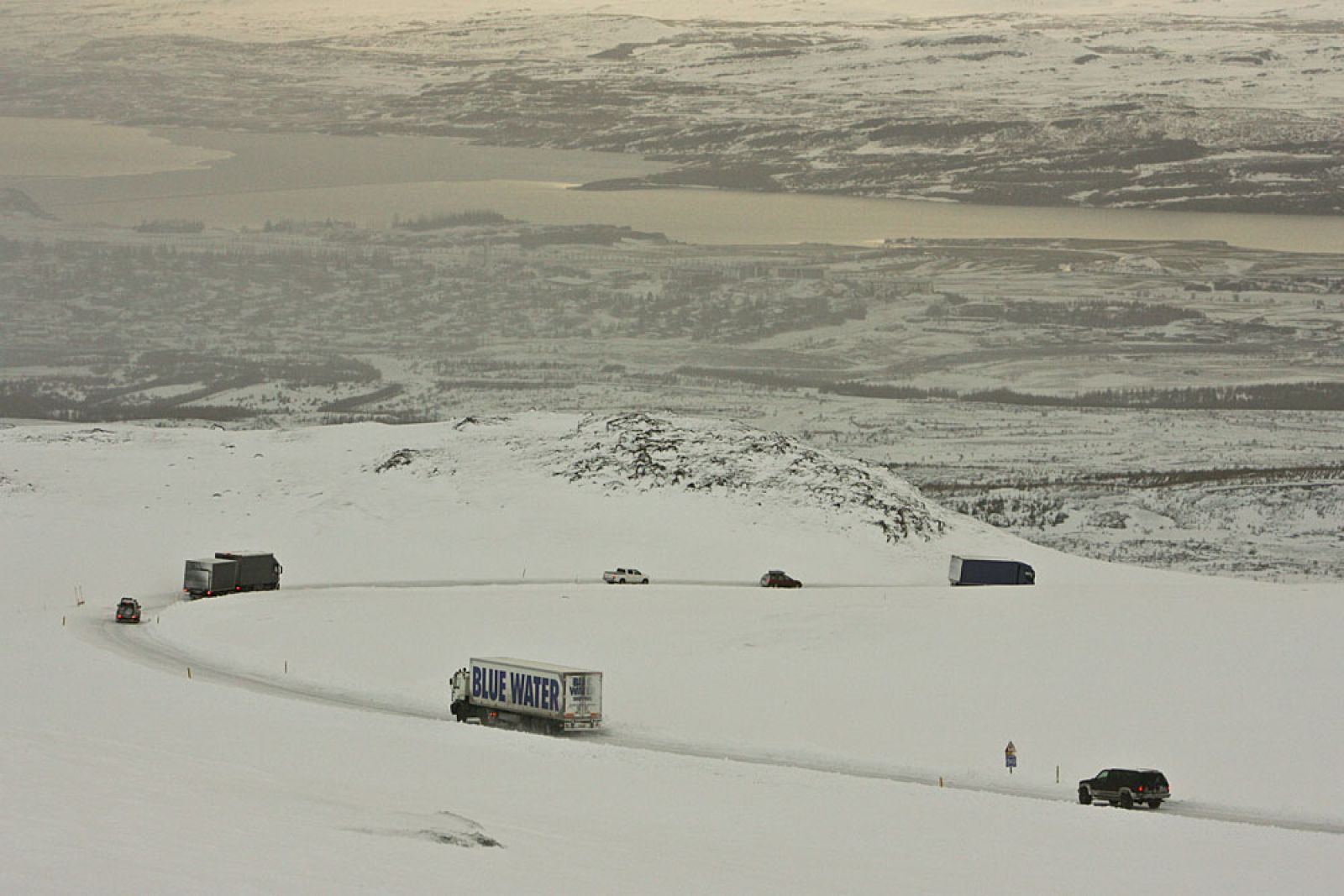 Helsta vandamálið í vegasamgöngum og birgðaflutningum til Austurlands er lokun vegna óveðurs milli Jökulsárlóns og Kirkjubæjarklausturs. Flutningabílar bíða þar sunnanvið eftir að komast austur.