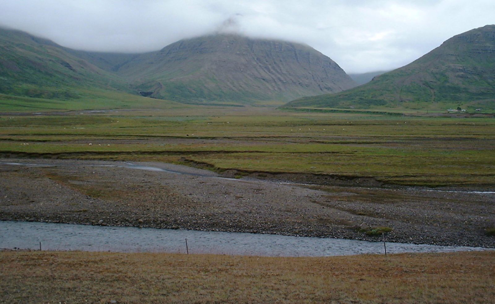 Séð yfir Fagradalsánna þar sem hún rennur innarlega í firðinum. Einn landeigandi þar hefur með stefnu sinni á hendur sveitarfélaginu stefnt öllum er þarna eiga land síðustu árin. Mynd Hafrannsóknarstofnun