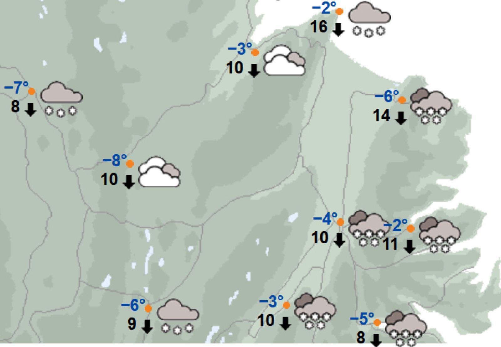 Eins og sjá má á korti Veðurstofunnar hér að ofan mun bæta mikið í snjókomuna síðdegis, vel fram á kvöld og jafnvel nótt en einhverri ofankomu er spáð áfram daglega alveg fram að helgi.