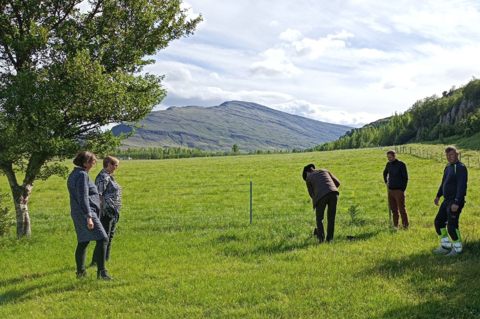 Reynitrénu plantað á besta stað við Végarð í blíðskaparveðri. Mynd Gísli Örn Guðmundsson