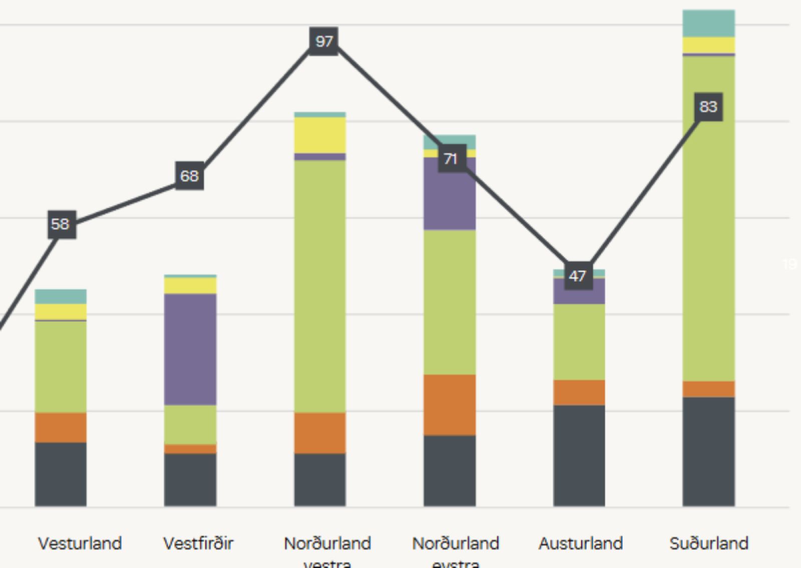 Að sama skapi er stór munur á heildarlánaupphæðum. Til Suðurlands eru útistandandi rúmir fimm milljarðar króna í lán frá Byggðastofnun eða helmingi hærri upphæð en lánað hefur verið austur á land. Rúmlega fjórir milljarðar útistandandi á Norðurlandi vestra og lítið eitt lægri upphæð farið til verkefna á Norðurlandi eystra