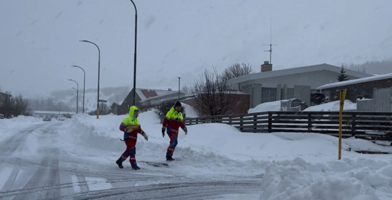 Björgunarsveitarfólk verið víða á vappi í Neskaupstað síðasta sólarhringinn að gæta að öryggi borgaranna og í sumum götum hefur þurft að gera það fótgangandi. Mynd Landsbjörg