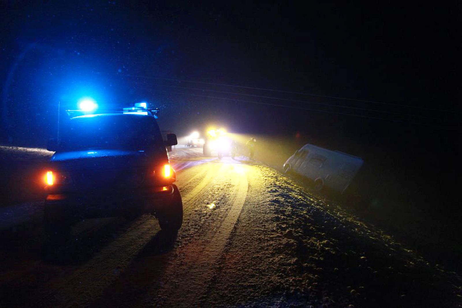 Flutningabifreið þverar nú Þjóðveg 1 utarlega í Fáskrúðsfirði eftir óhapp fyrr í morgun en töluverð hálka er á svæðinu.