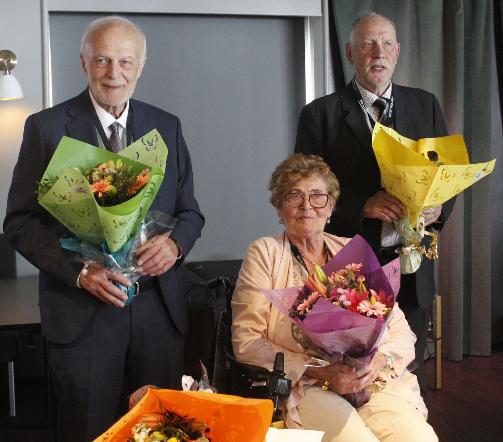 Aðeins fjórir eru eftirlifandi af níu manna bæjarstjórn Seyðisfjarðar 1975. Þrír þeirra komust á hófið í gær og var fólkið heiðrað sérstaklega með blómvöndum. Slík vendi fengu jafnframt tveir yfirmanna Smyril Line Ísland. Mynd AE