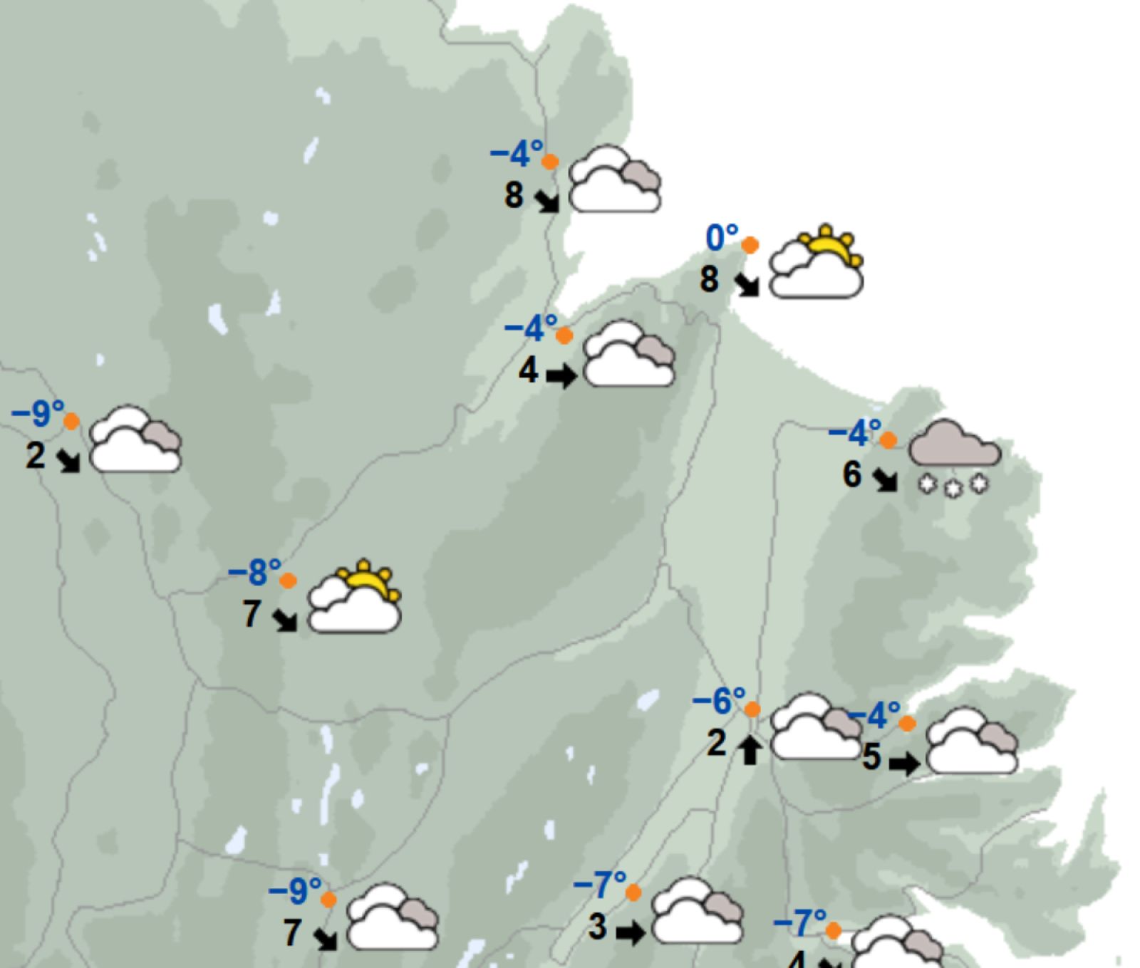 Spá Veðurstofu Íslands gerir ráð fyrir töluverðu frosti víðast hvar á Austurlandi vel frameftir næstu viku. Skjáskot