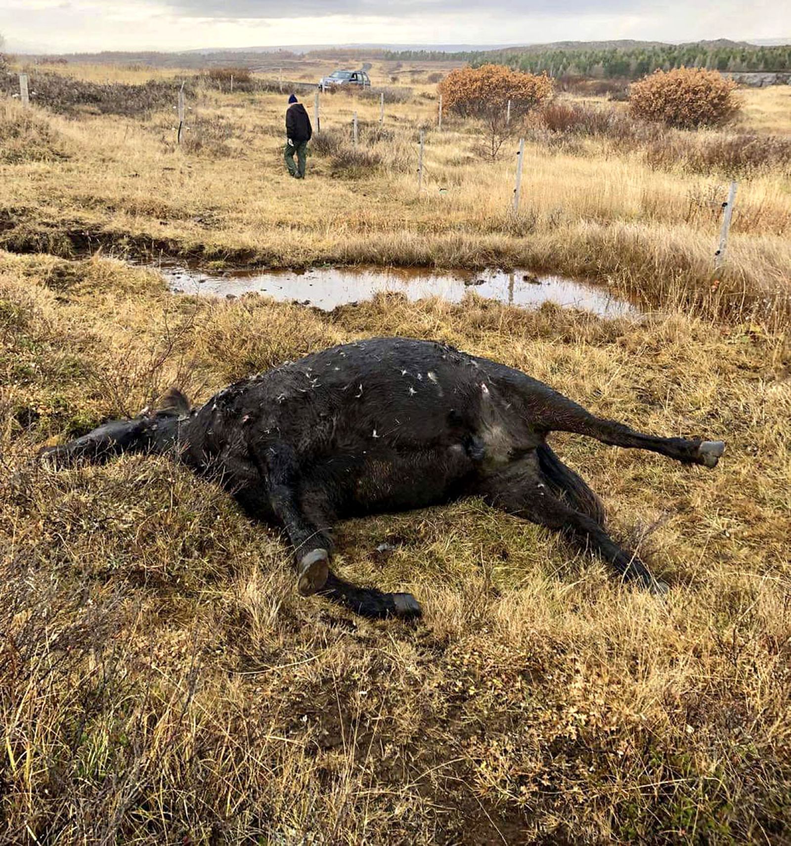 Við höfum ekki fundið neina kúlu svo það er ekki ljóst hvort þetta hafi verið skot í gegn. Innskotið getur verið lítið og hann lá á þeirri hlið. Að minnsta kosti fór eitthvað inn í hestinn sem skaddaði hjarta eða slagæð og sennilega hefur honum blætt út innvortis í kjölfarið.