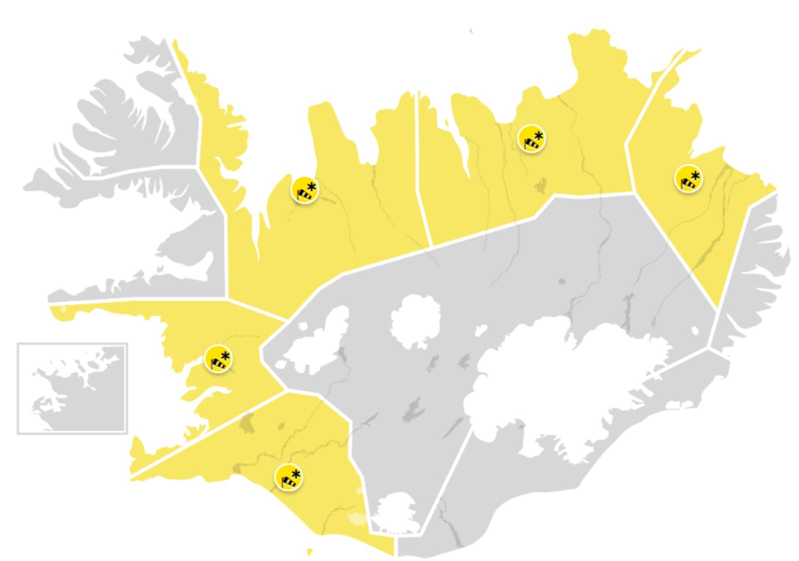 Viðvörunarkort Veðurstofunnar. Það óvenjulegt að því leyti að það nær hálfhring um landið en ekki inn á hálendið eða firði austurlands. Skjáskot
