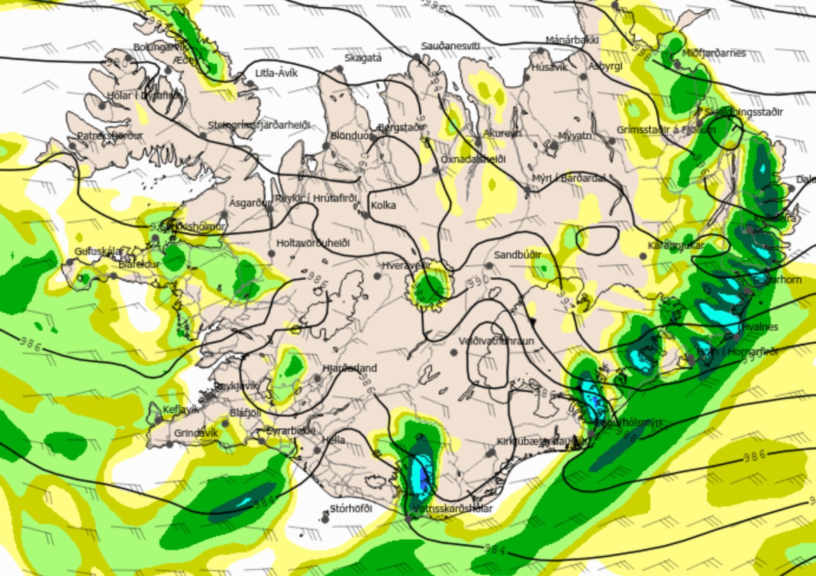 Telja fræðingar Veðurstofunnar verulegar líkur á samgöngutruflunum vegna ofankomunnar á fimmtudag en glögglega sést á meðfylgjandi korti að hún verður töluverð. Því grænni sem liturinn á kortinu er því meiri er úrkoman. Spár gera ráð fyrir að hún geti orðið allt að 10 mm á klukkustund þegar verst lætur um miðjan dag. Einnig er gert ráð fyrir nokkurri úrkomu á föstudag.