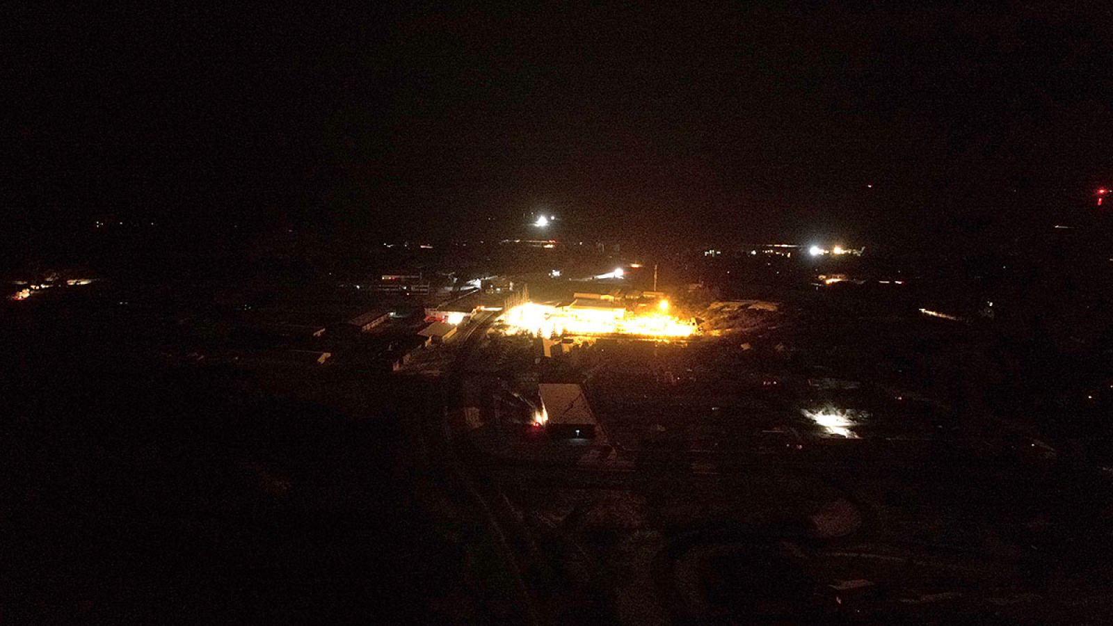 Frá Egilsstöðum í rafmangsleysinu í gærkvöldi. Fyrir miðri mynd er húsnæði Rarik með upplýst. Mynd: Unnar Erlingsson