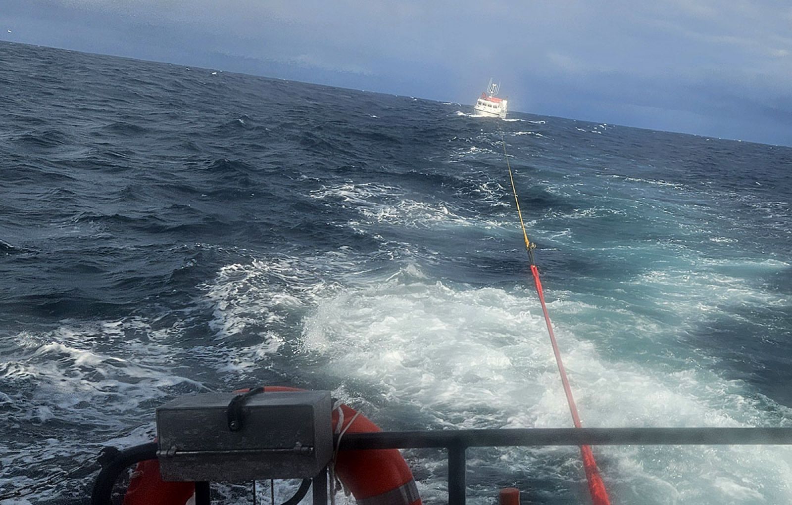 Hafbjörgin kom að Vésteini skömmu upp úr klukkan þrjú. Stuttu síðar var komin taug á milli skipanna og stefna þau nú inn til Neskaupstaðar.
