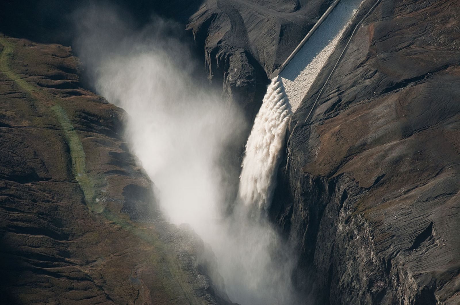Yfirfallið er þegar yfirborð lónsins er komið í 625 metra hæð yfir sjávarmál. Rennur vatnaði þá framhjá stíflunni niður rennu þar sem það steypist ofan í Hafrahvammagljúfur og myndar fossinn Hverfanda.