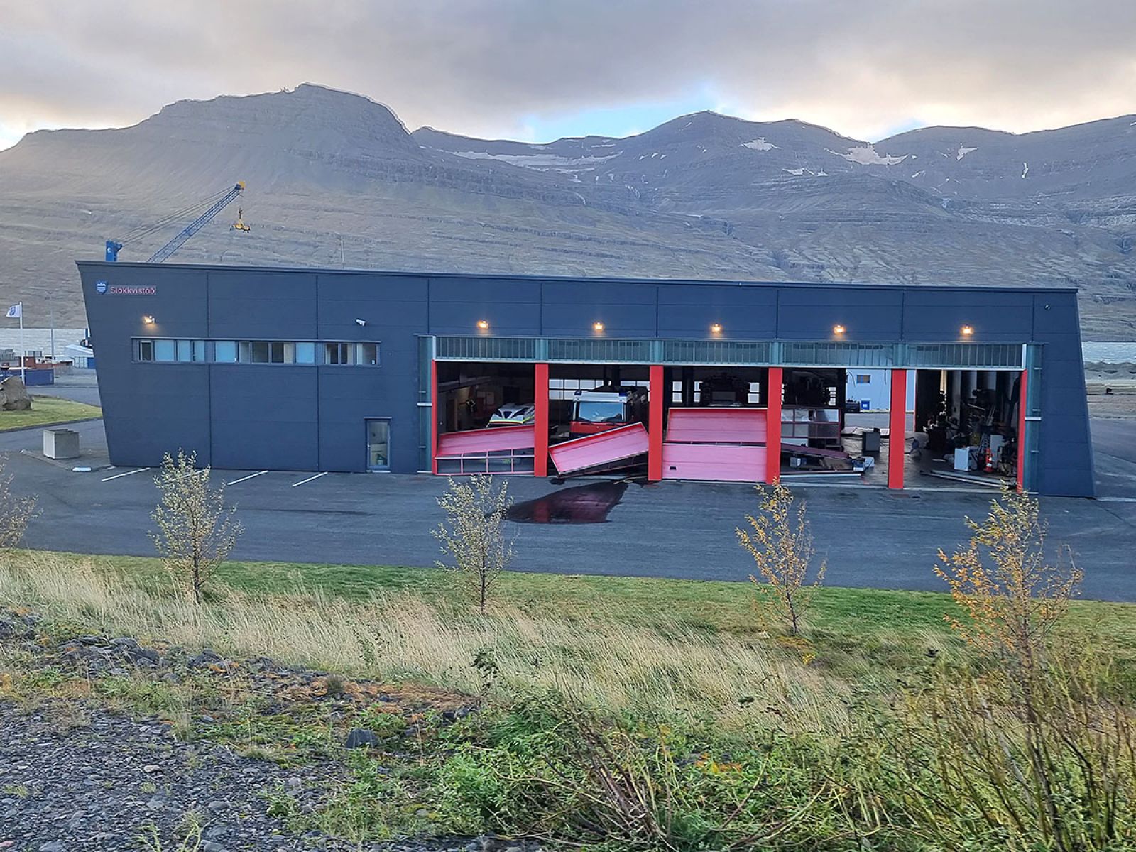 Mikið tjón varð á slökkvistöðinni á Hrauni, við álverslóðina á Reyðarfirði, þar sem hurðir og veggplötur sprungu af húsinu. Vaktþjónustu hefur verið komið í skjól hjá björgunarsveitinni á Reyðarfirði.