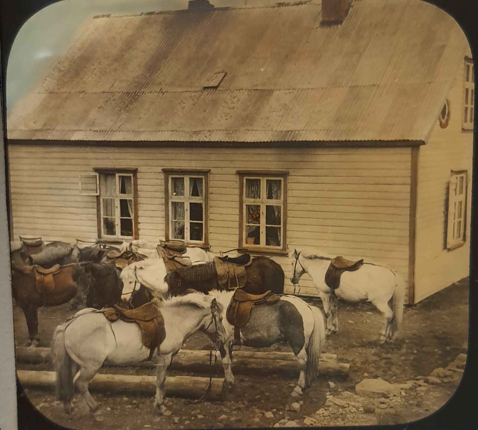 Myndin sýnir hrossahóp með reiðtygjum við hús á Seyðisfirði sem reist var árið 1887 undir starfsemi Pöntunarfélags Fljótsdalshéraðs á svonefndum Svendsengrunni við Hafnargötu, milli Þórshamars og Skipasmíðastöðvarinnar,“ segir Stefán á Facebook.