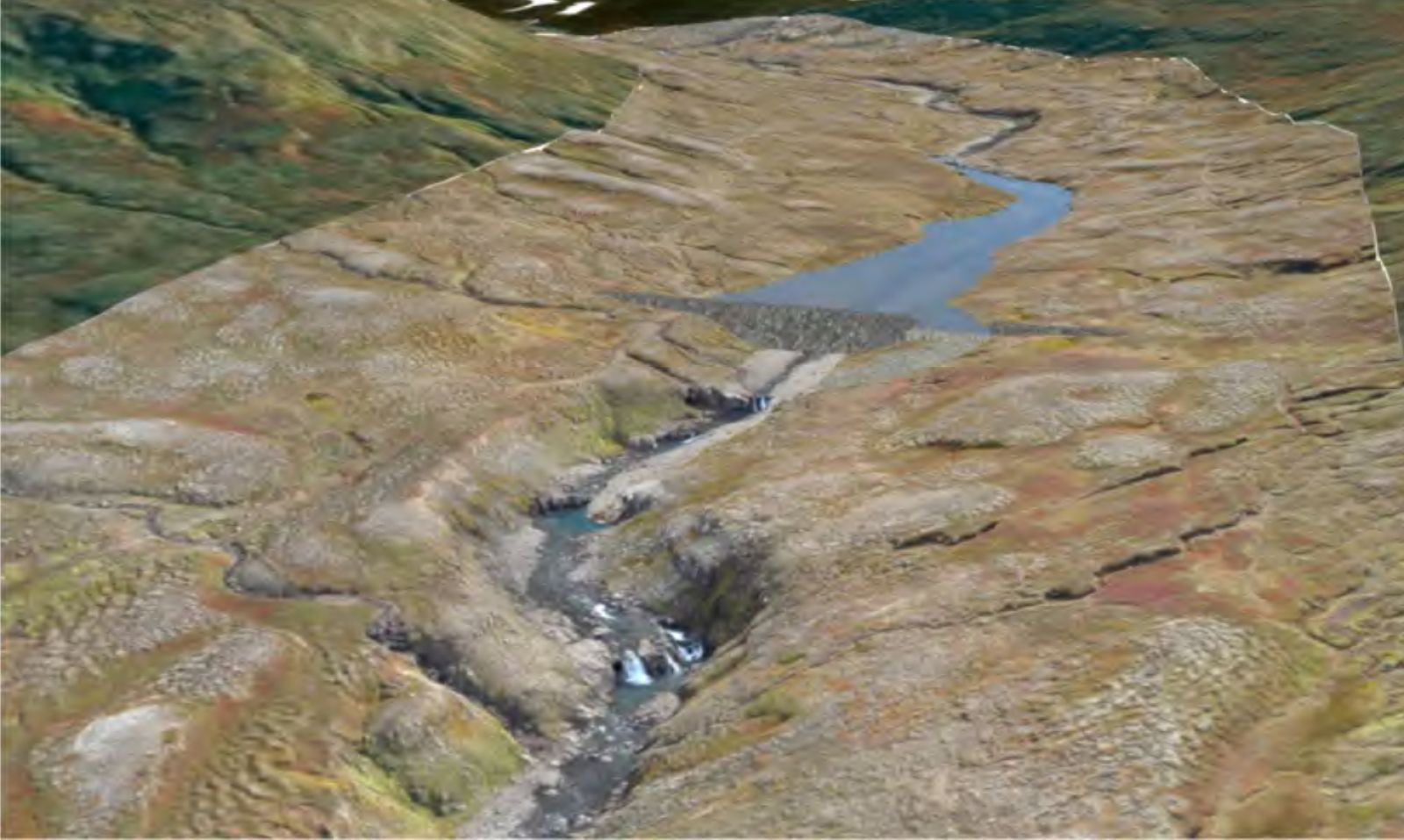 Tölvuteikning af fyrirhugaðri virkjun. Fallhæð hennar verður 277 metrar og því um stórt mannvirki að ræða. Mynd Orkusalan