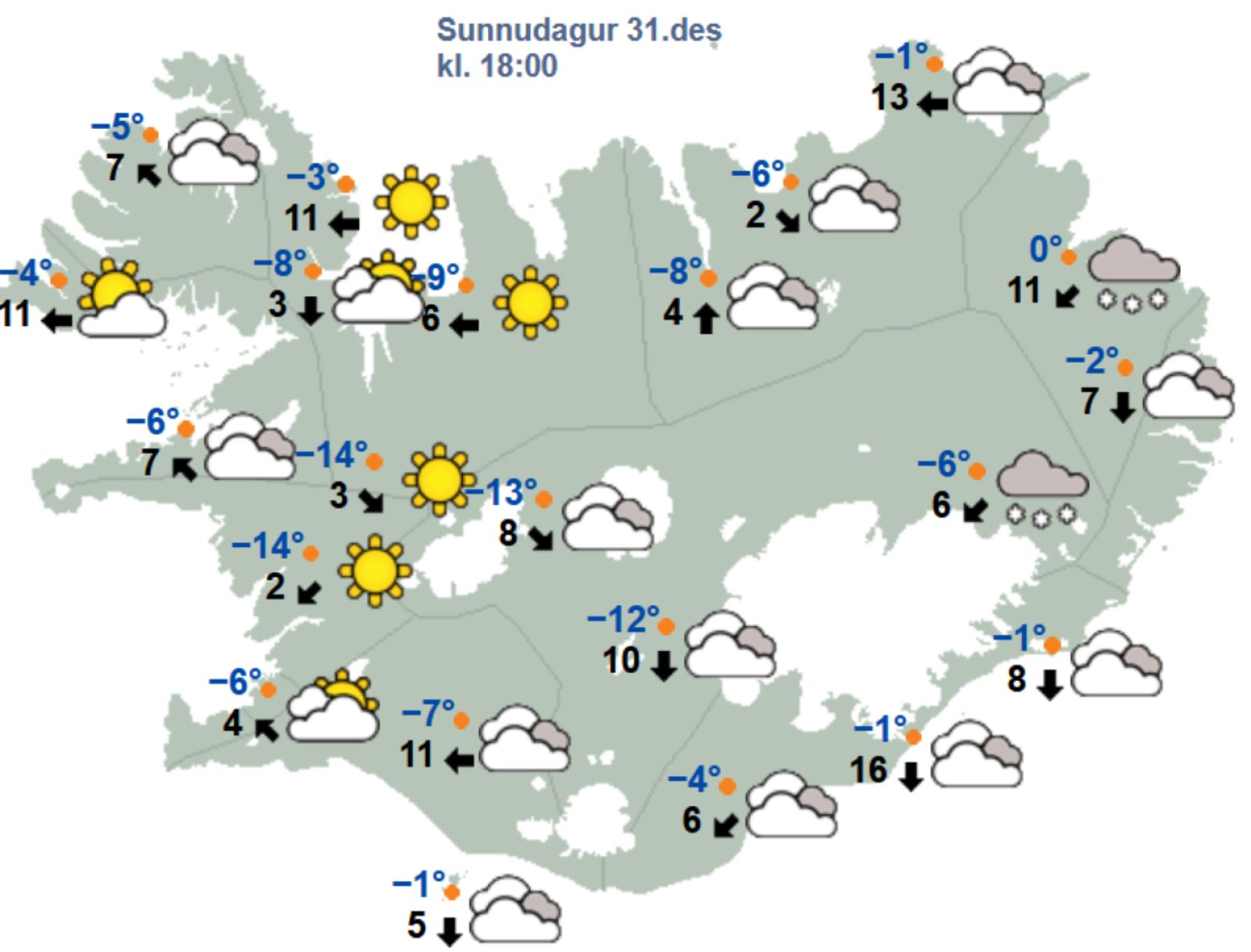 Tíu til tólf stiga frost er ríkjandi um mestallt Austurland í dag og frameftir nóttu en á morgun laugardag mun frostið minnka niður í fimm til átta stig um mestallan fjórðunginn. Það minnkar svo enn duglega á gamlársdag og nýtt ár mun heilsa með töluverðum hlýindum miðað við árstíma.