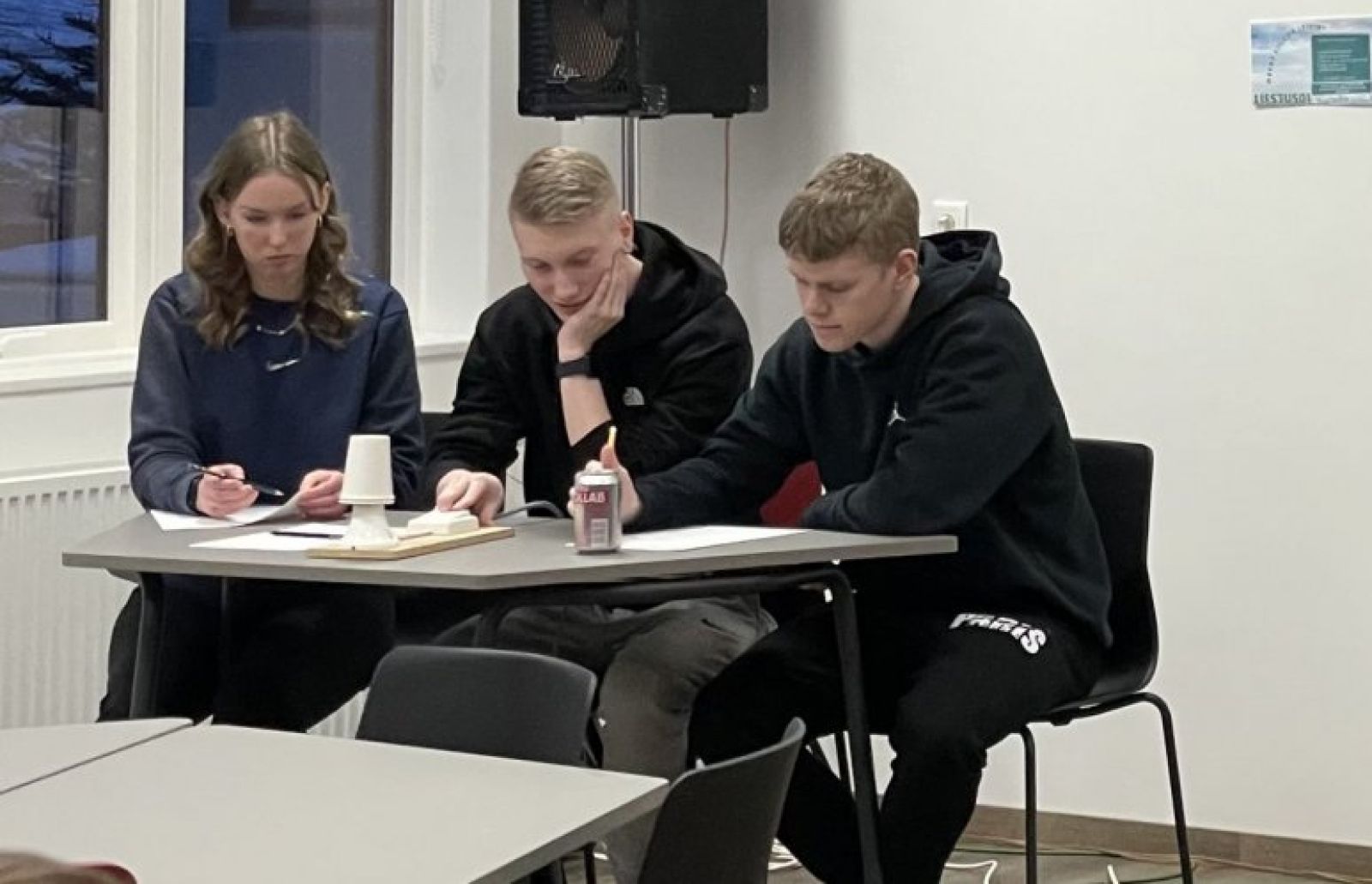 Keppendur VA að undirbúa sig undir átökin annað kvöld. Liðið samanstendur af Ágústu Völu Viðarsdóttur og tvíburabræðrunum Geir Sigurbirni og Ragnari Þórólfi Ómarssonum.