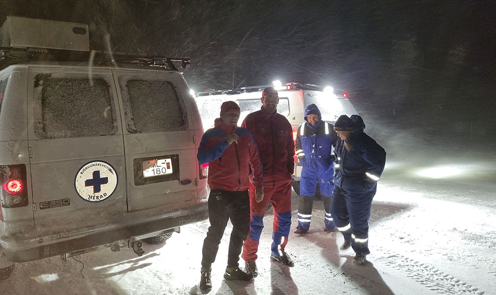 Björgunarsveitarfólk frá Borgarfirði og Héraði hjálpaðist að við að koma kjörgögnum í Egilsstaði. Gögnin voru ferjuð á milli bíla á Vatnsskarði í kvöld. Mynd: Björn Aðalsteinsson