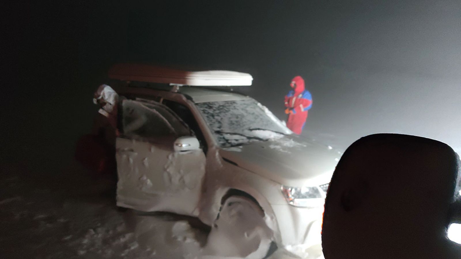 Björgunarsveitin nálgaðist fólkið úr norðri og kom að því um klukkan ellefu í gærkvöld. Ákveðið var að fara áfram til suðurs niður í Brú, bæði því betra væri að keyra undan veðrinu og styttra en þá reyndist „allt komið á kaf í snjó.“ Endaði það með því að um eitt leytið sat björgunarsveitarbíllinn fastur og báru tilraunir til að losa hann engan árangur. Reynt var að fara á móti honum neðan úr dal á stórri dráttarvél en það gekk ekki heldur.