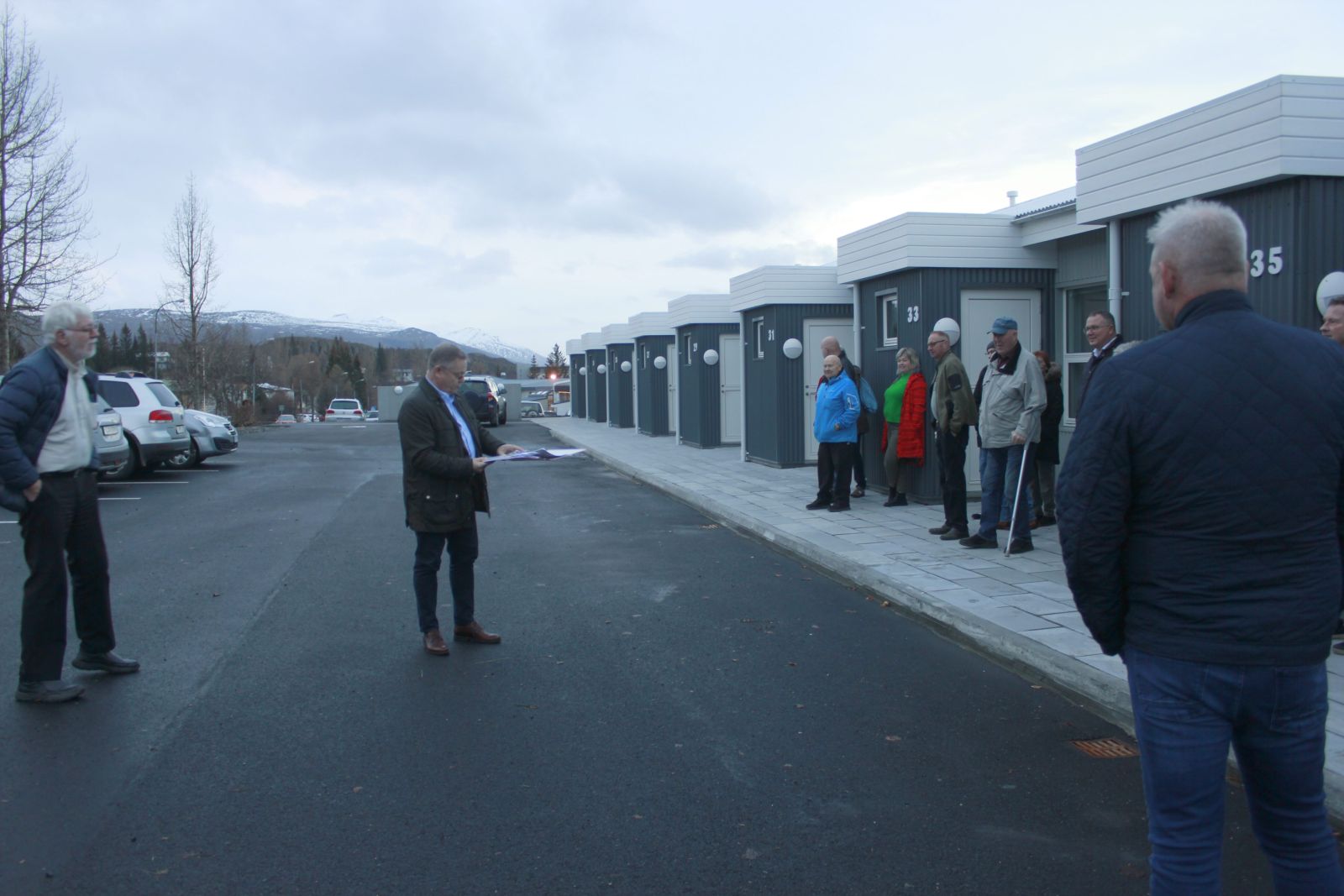 Sveitarstjórinn Björn Ingimarsson afhenti lyklavöld að öllum tíu íbúðunum og fór ekki á milli mála að allir voru mjög ánægðir með nýju híbýlin. Einn gekk svo langt að segja íbúðirnar of flottar. Mynd AE