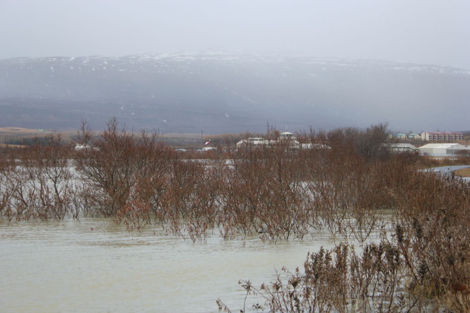 Mynd tekin um hádegisbil í dag fyrir framan flugvallarstæðið. Kunnugir segja allnokkur ár vera síðan svo mikið sást í fljótinu en engin hætta er á að það hafi áhrif á flugvöllinn eða starfsemi þar.
