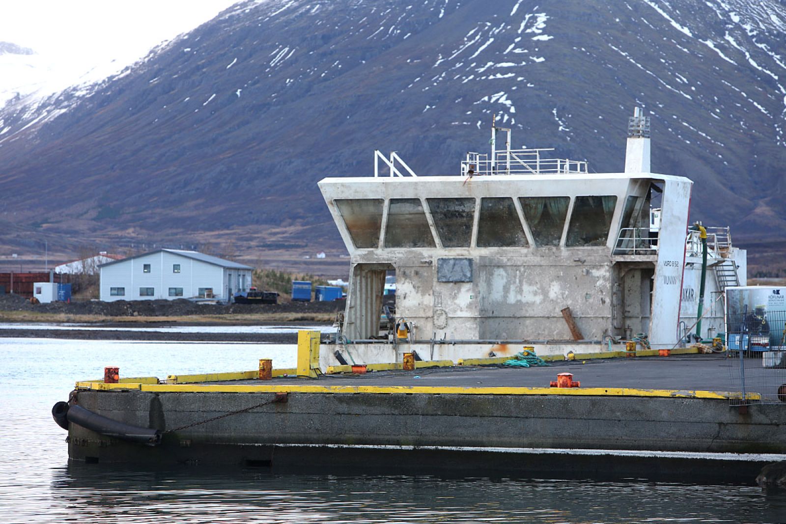 Fóðurprammanum var í lok sumars lyft upp af hafsbotni og dreginn inn í höfnina á Reyðarfirði. Þar var fóðri dælt upp úr honum áður en honum var loks lyft öllum upp fyrir um mánuði.