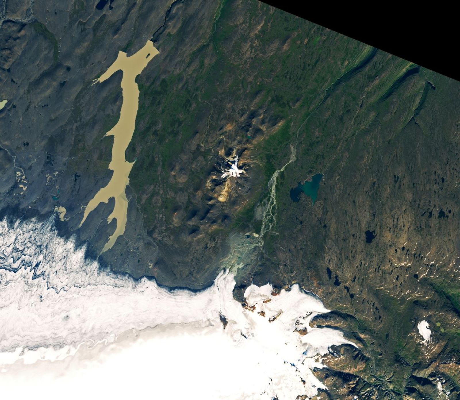 Mynd: Myndin er frá Aqua gerfihnetti NASA en hún er tekin 9. september s.l. Fyrir miðju er Snæfell en til vinstri á myndinni má sjá Hálsalón og til hægri er Jökla.