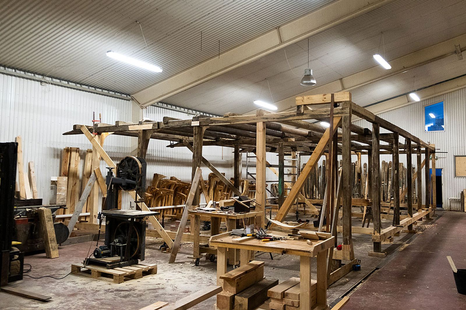 Byrjað er að smíða grind Angró þannig gestir í dag eiga að geta fengið tilfinningu fyrir húsinu. og rótarhné, sem eru einkennandi fyrir húsin, eru komin til landsins frá Noregi, þar sem þau voru smíðuð og verða til sýnis. Næstu verða smíðaðar hurðir og gluggar þannig hægt verði að reisa húsið næsta sumar.
