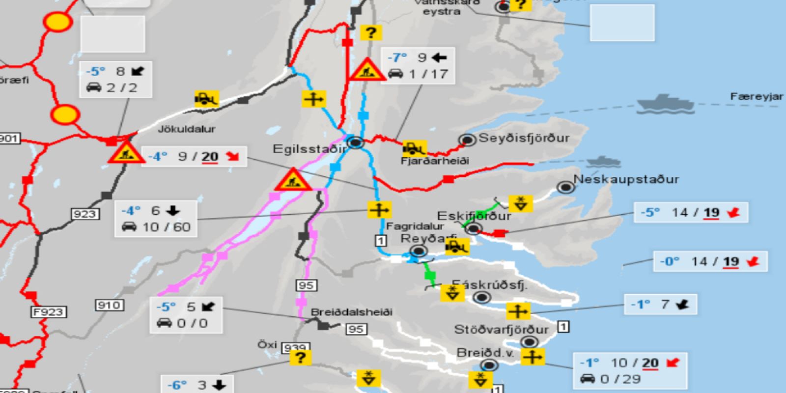 Starfsmenn Vegagerðarinnar hafa unnið hörðum höndum síðustu klukkustundir til að opna vegi austanlands en víða er þó enn illfært eða beinlínis lokað þegar þetta er skrifað eins og sjá má á meðfylgjandi korti.