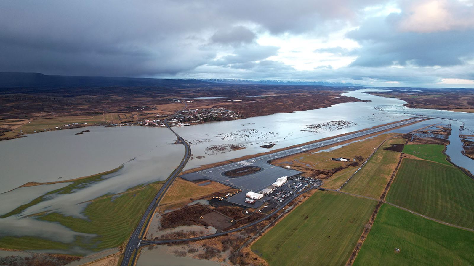 Horft frá Egilsstöðum út eftir Lagarfljótinu þegar það síðast flæddi yfir bakka sína. Ekki er talið útilokað að heitt vatn finnist undir fljótinu sjálfu og rannsóknir á því standa yfir. Mynd GG