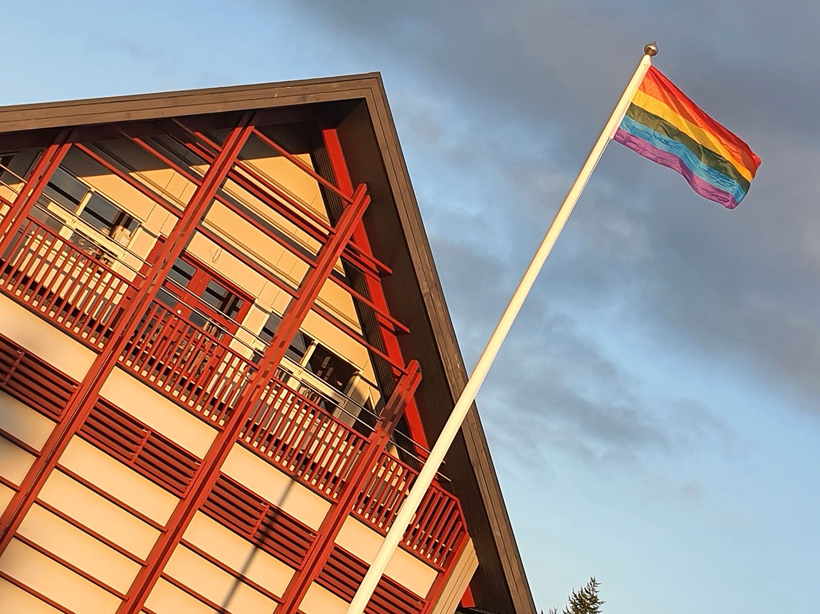 Regnbogafáninn blaki við bæjarskrifstofurnar til stuðnings samfélags hinsegin fólks. Nýr fáni var settur upp strax í gærmorgunn.