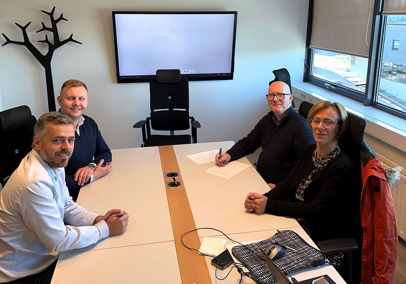 Austfirðingar við undirritun samningsins í dag. Frá vinstri: Andri Reyr Haraldsson, formaður Rafiðnaðarsambandsins, Runólfur Sigmundsson, fjármálastjóri Fjarðaáls, Smári Kristinsson, framleiðslustjóri Fjarðaáls og Hjördís Þóra Sigurþórsdóttir, formaður AFLs. Mynd: Aðsend