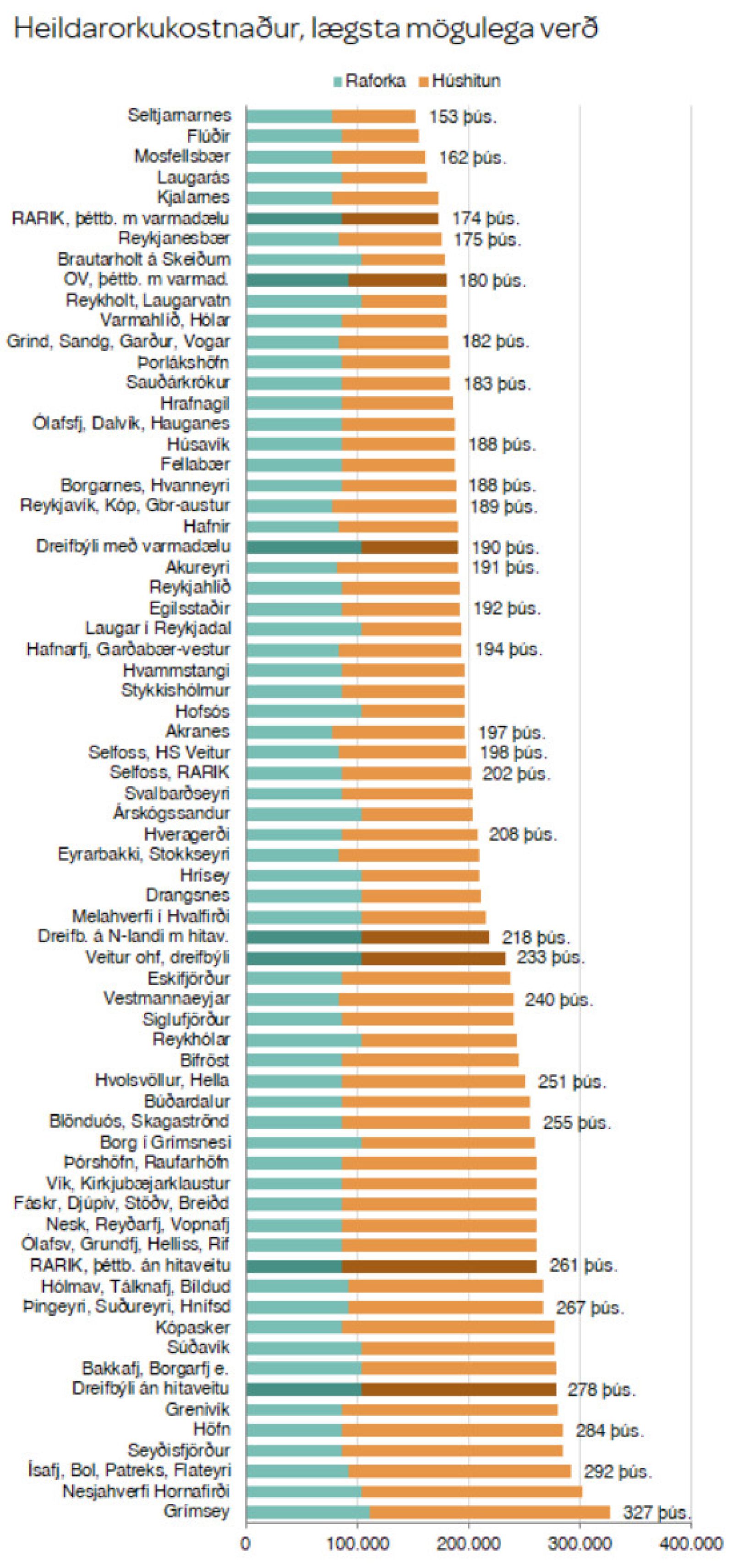 Stofnunin tekur þar stöðuna hjá 92 byggðakjörnum í landinu og sem fyrr eru þéttbýliskjarnar Austurlands, að Egilsstöðum frátöldum, mjög neðarlega á blaði. Viðmiðið í skýrslunni er hita- og raforkukostnaður á ársgrundvelli í 140 fermetra einbýlishúsi.