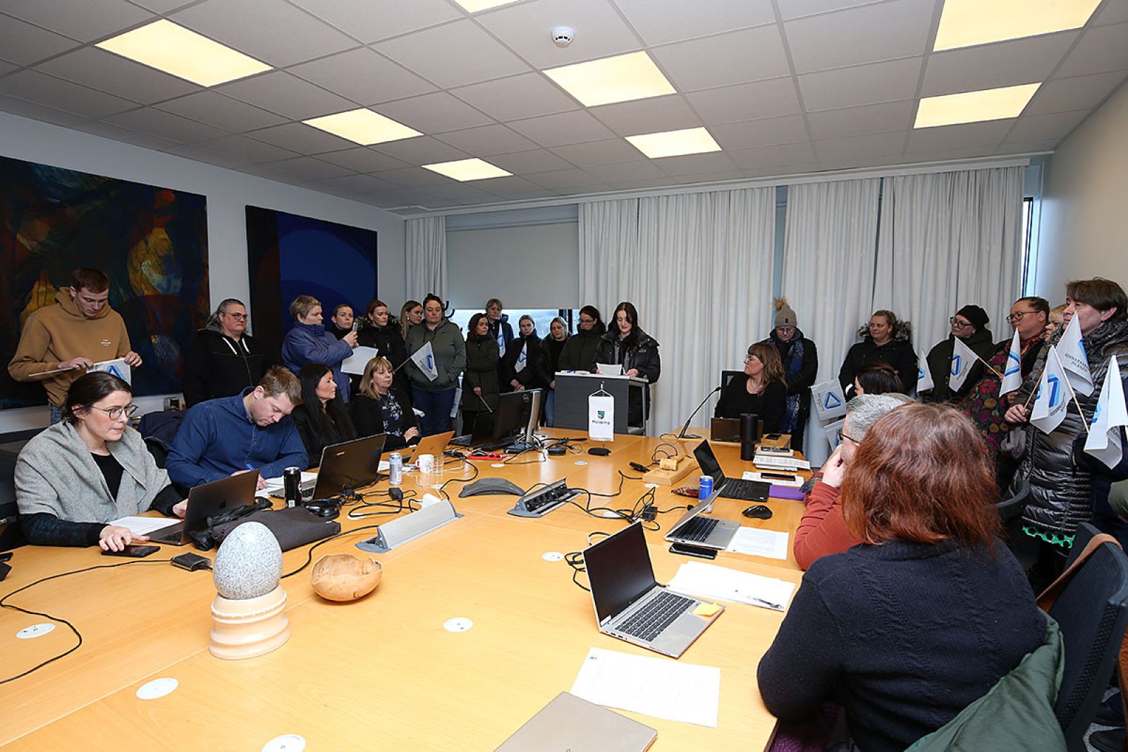 Kennarar við skólann mættu margir hverjir í fundarsal sveitarstjórnar við upphaf fundar hennar eftir hádegi. Þeir voru í verkfalli í síðustu viku en mættu aftur til vinnu á mánudag, margir svartklæddir, eftir að verkföllum voru dæmd ólögleg. Félagsdómur taldi ekki heimilt að boða verkföll í stökum skólum innan sveitarfélaga, því þeir væru ekki vinnuveitendur heldur sveitarfélögin.