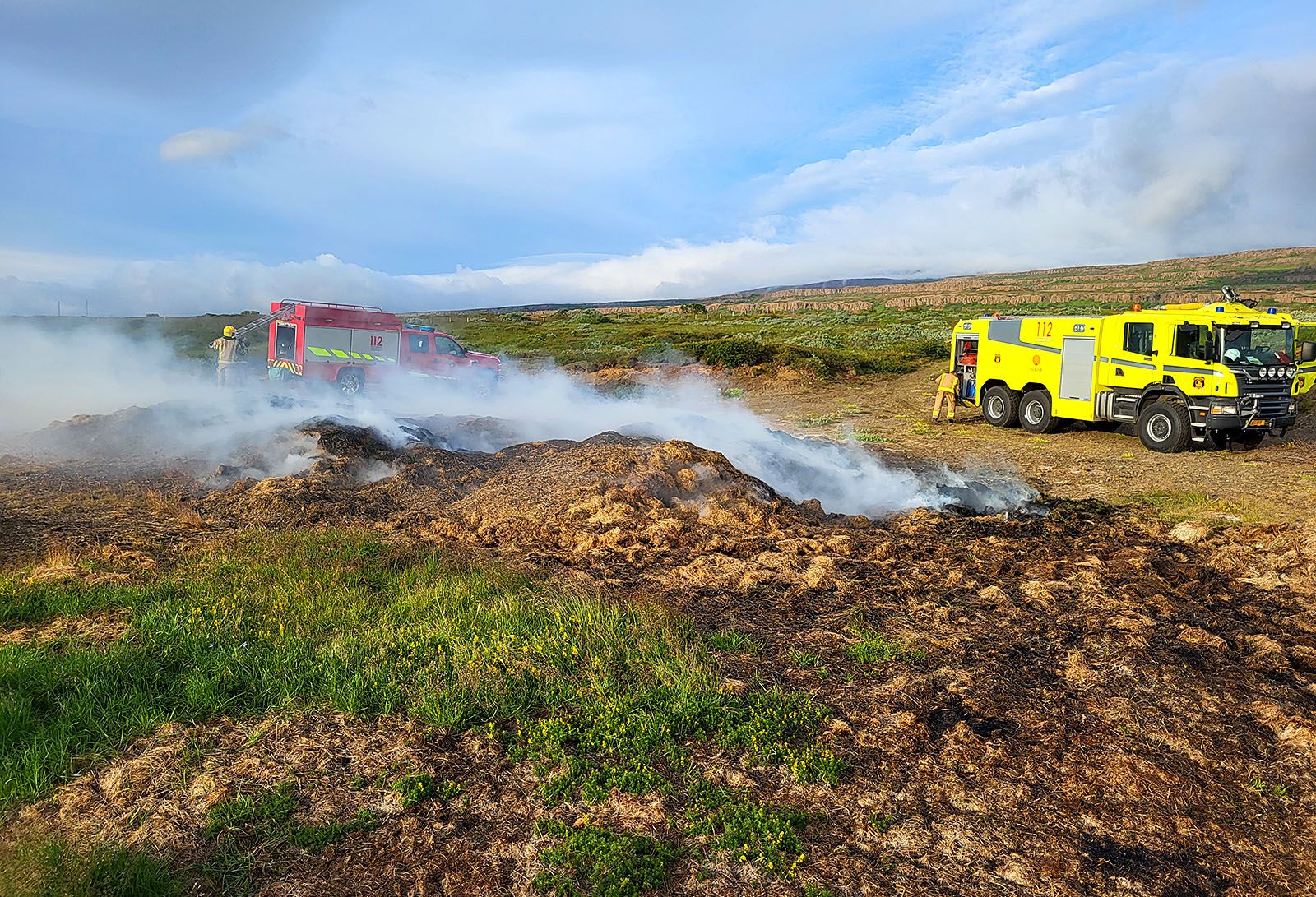 Slökkviliðið var upphaflega kallað út klukkan 18:45 vegna gróðurelds. Fljótlega varð ljóst hvernig í hlutunum lá. Verið var að brenna rusli en eldurinn barst í heyrúllurnar.