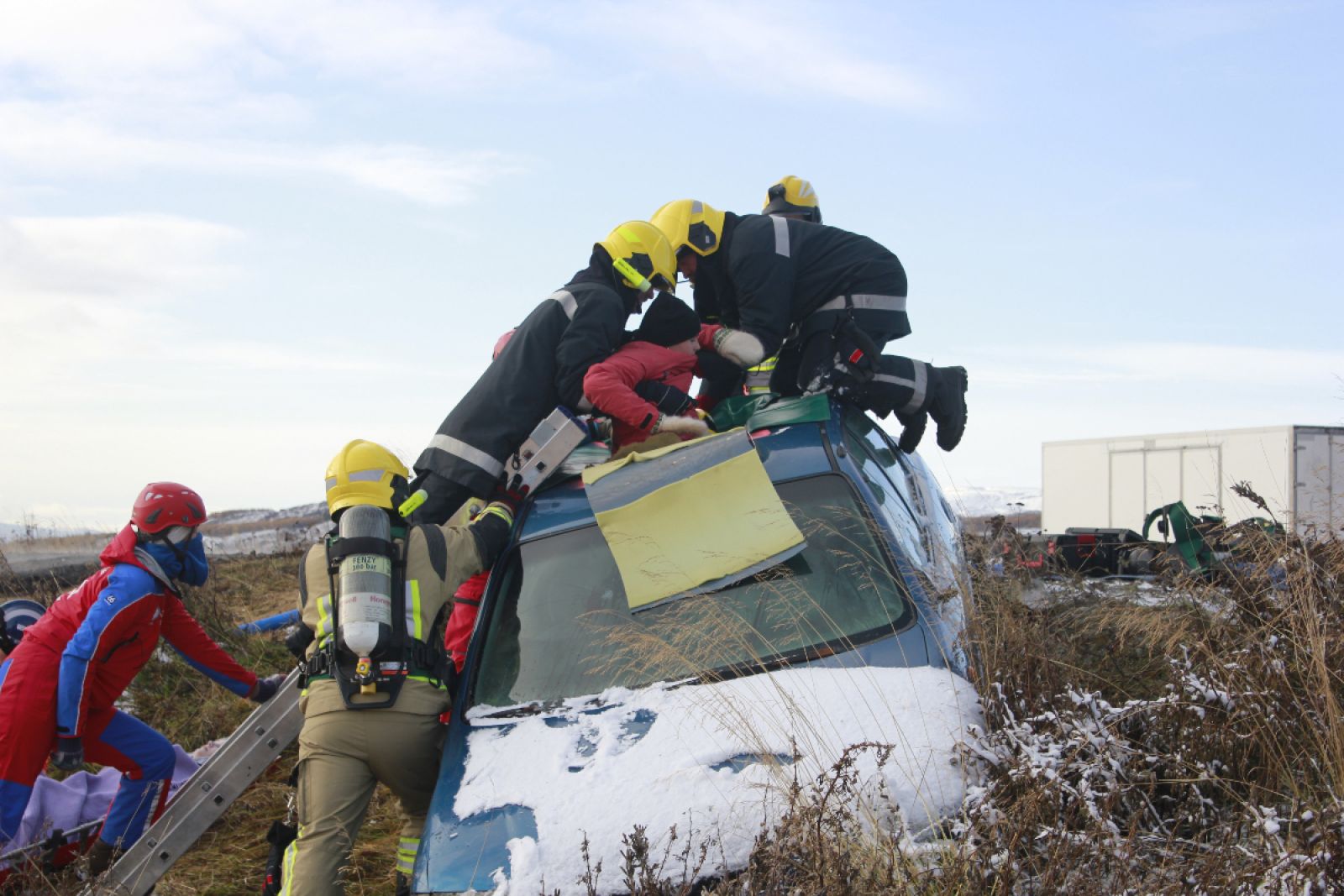 Bjarga þurfti slösuðu fólki úr flaki beggja véla sem brotlendu á æfingunni í dag. Til þess þurfti að rjúfa stál og ál til að komast að fólkinu og margar hendur til að koma fólkinu út eins fljótt og auðið var. Mynd AE