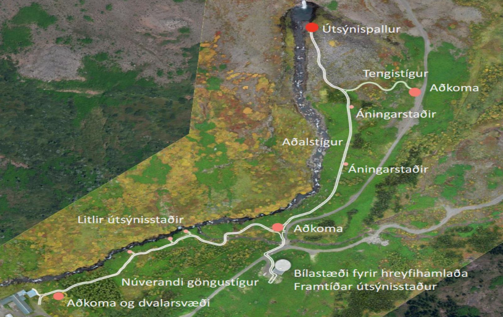 Hugmyndir Eflu ganga út á að byggja upp aðalgöngustíg sem yrði aðgengilegur fyrir fjölbreyttan hóp fólks. Á þeim stíg verði gert ráð fyrir áningarstöðum með 100 metra millibili og við enda hans yrði byggður útsýnispallur. Þaðan yrði líka tengistígur fyrir þá sem vilja ganga hringleið ellegar halda lengra áfram upp með ánni.