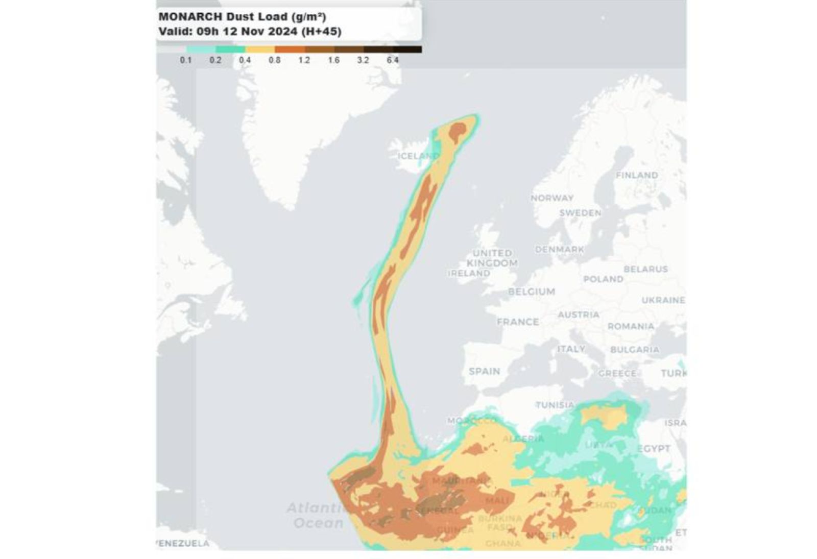 Það ekki óþekkt að ryk- eða sandstormar af hálendinu dreifist yfir austfirsk fjöll og dali við tileknar aðstæður. Hins vegar mjög óvenjulegt að slíkt berist alla leiðina frá miðbaug í Afríku eins og raunin hefur verið síðasta sólarhring eða svo.