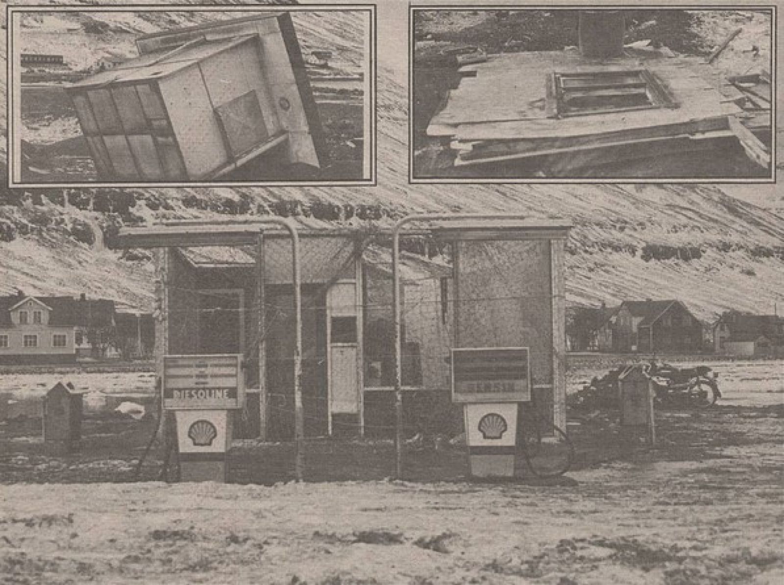 Lögreglustöðin var þá í bráðabirgðahúsi á hafnarbakkanum. Þar skammt frá var bensínskáli Shell sem slapp litlu betur. Þakið fauk af honum í heilu lagi og hliðar skálans rifnuðu út. Ingimar Hjálmarsson, fréttaritari Tímans, lýsir því að hann hafi horft upp á frambyggðan Rússajeppa fjúka á toppinn þegar hann hafi verið að snúa við af götu. Við má bæta að Friðrik Indriðason, sem síðar vann á Austurfrétt/Austurglugganum, tekur saman tíðindin frá fréttariturum Tímans um landið.
