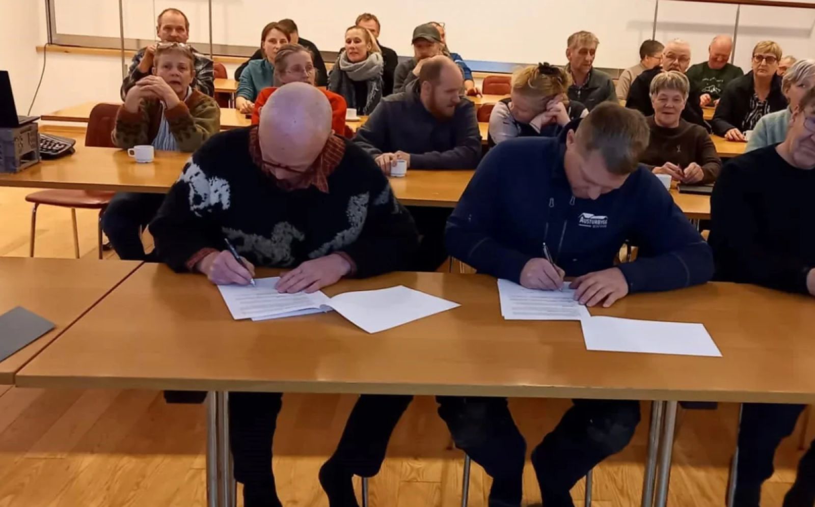 Oddviti Fljótsdalshrepps, Jóhann F. Þórhallsson, og Ívar Karl Hafliðason, verktaki, skrifa undir verksamning um lokafrágang að nýrri þjónustumiðstöð. Mynd HG
