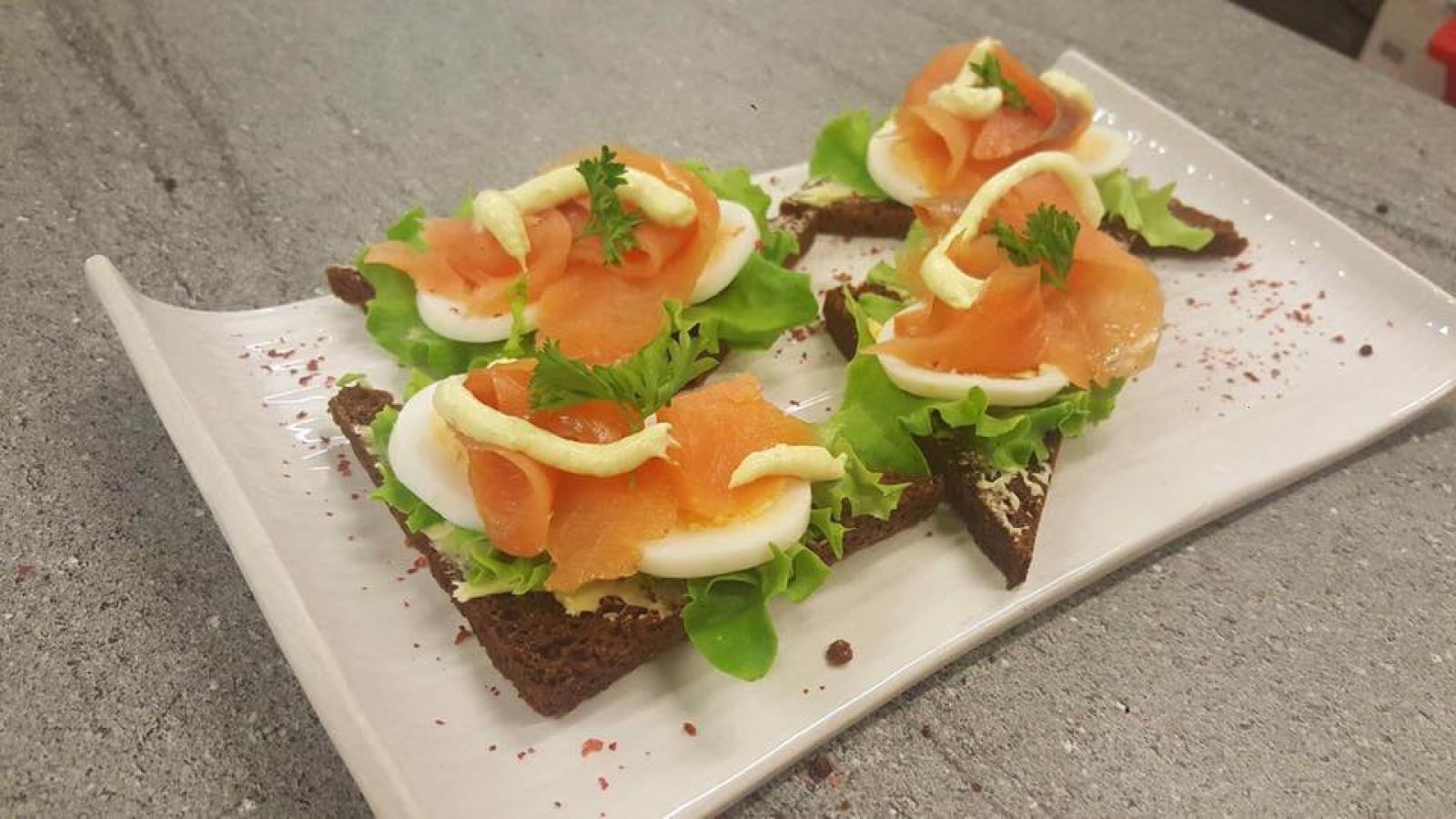 Þrumari – snitta, taðreyktur lax, eggjasalat, skraut