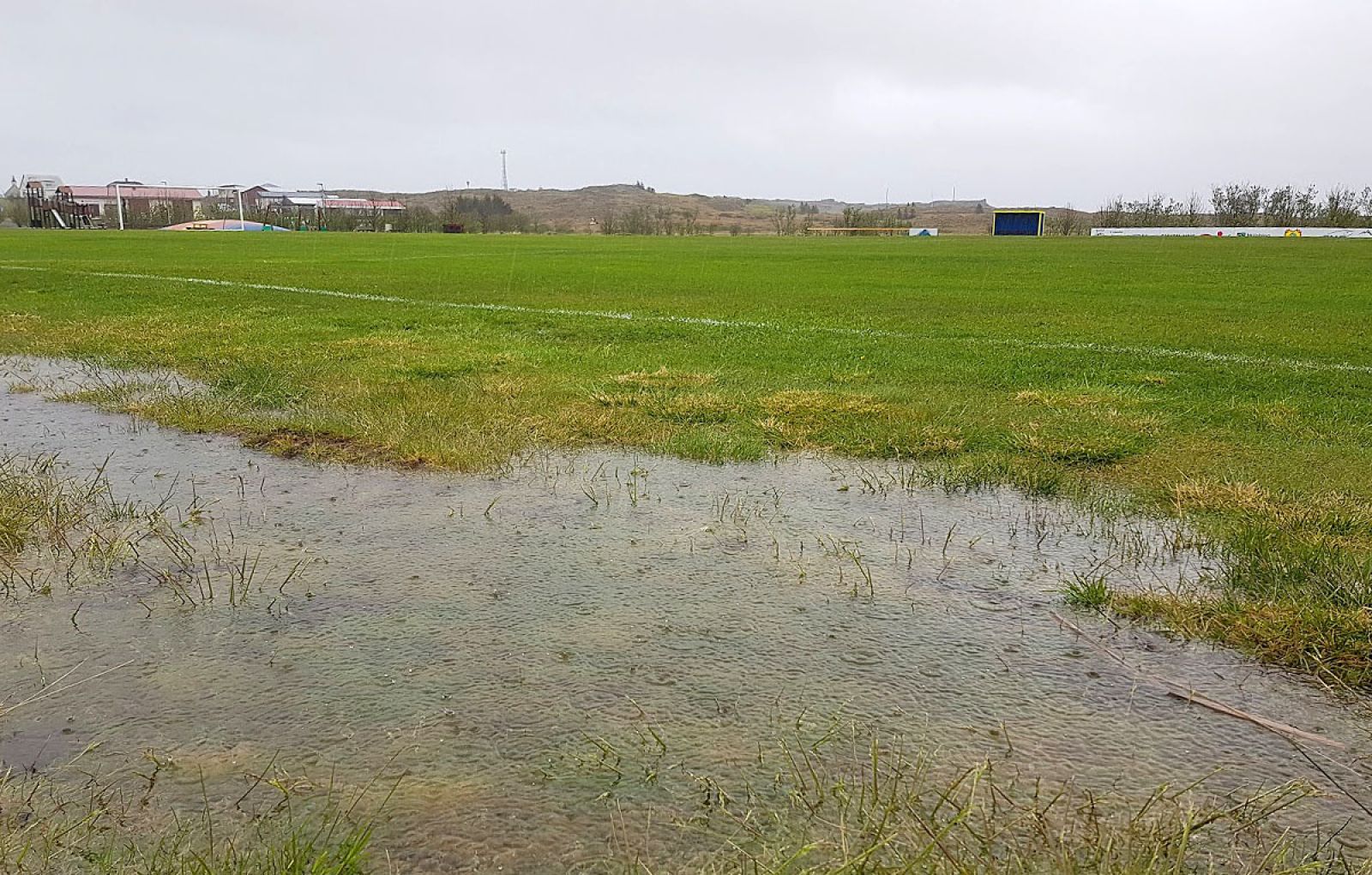 Kristján lýsir því að í allt í kringum leikvöllinn séu pollar og hann sjálfur dúi þegar gengið sé inn á hann. „Þetta þykir skynsamlegt, bæði út frá öryggi leikmanna og því hvernig völlurinn getur farið. Það var komin mikil stemming fyrir leiknum en það er ekkert við þessu að gera. Við mætum klárir til leiks þegar hann verður,“ segir Kristján en nýr leiktími hefur ekki verið staðfestur.