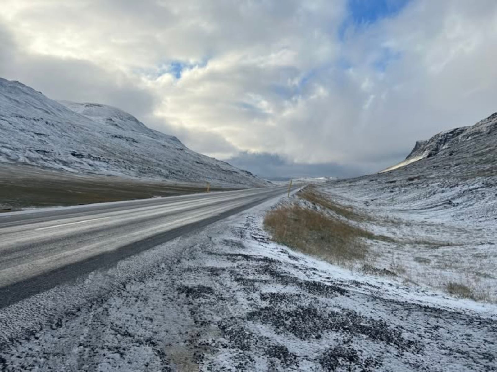 Meðfylgjandi mynd frá lögreglunni sýnir glögglega stöðuna á Fagradal fyrr í morgunn en ekki er svo algengt að snjór og frost geri vart við sig svo snemma að hausti þó það sé ekki einsdæmi. Þá kemur kuldakaflinn beint í kjölfar töluverðra rigninga víða í fjórðungnum svo gerir illt verra.